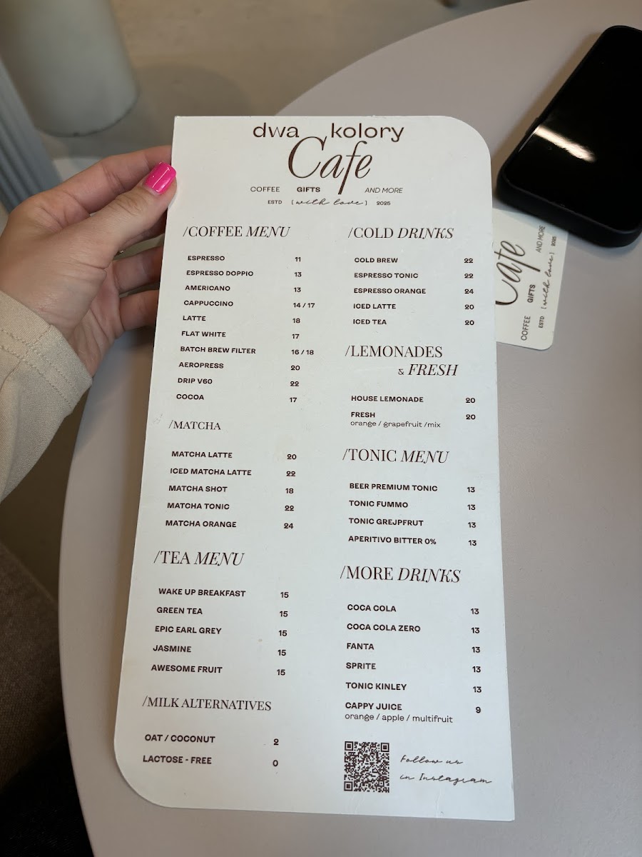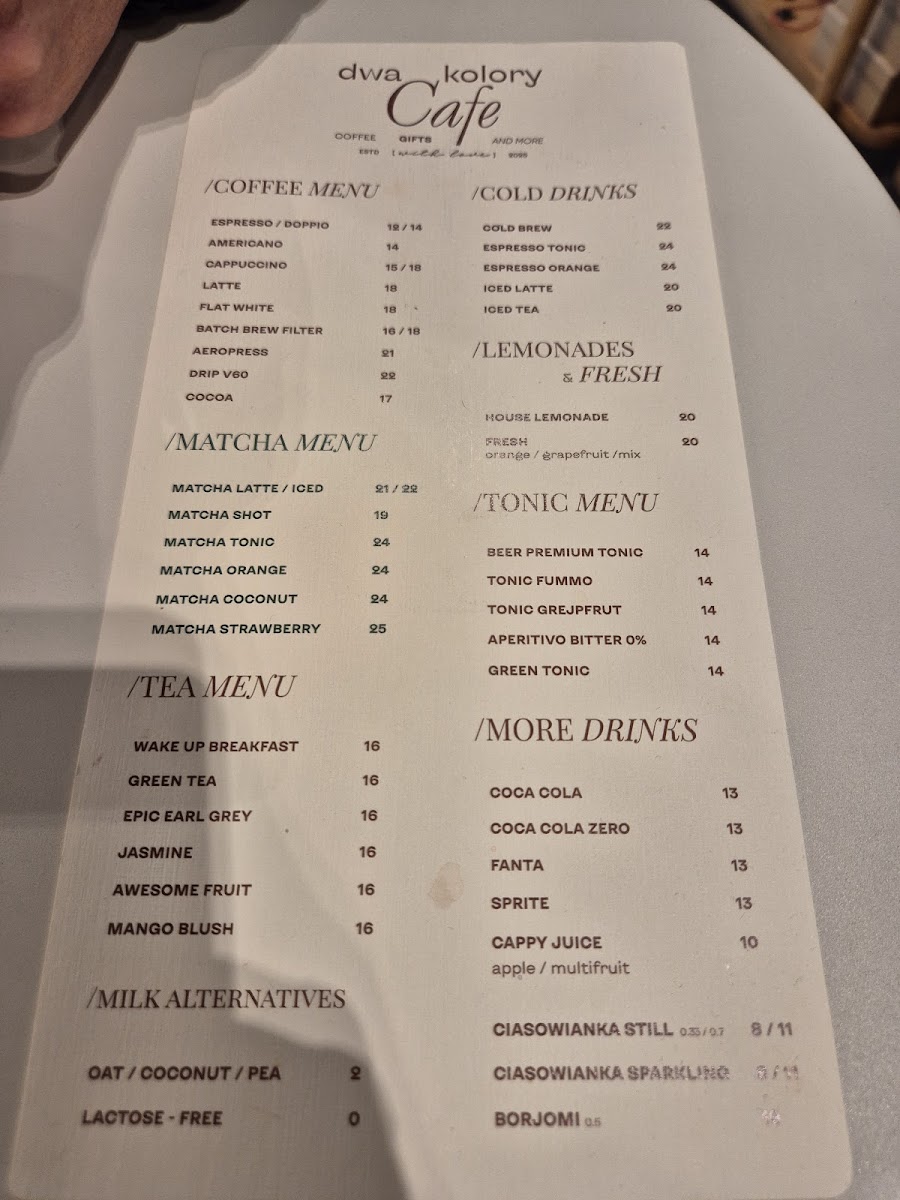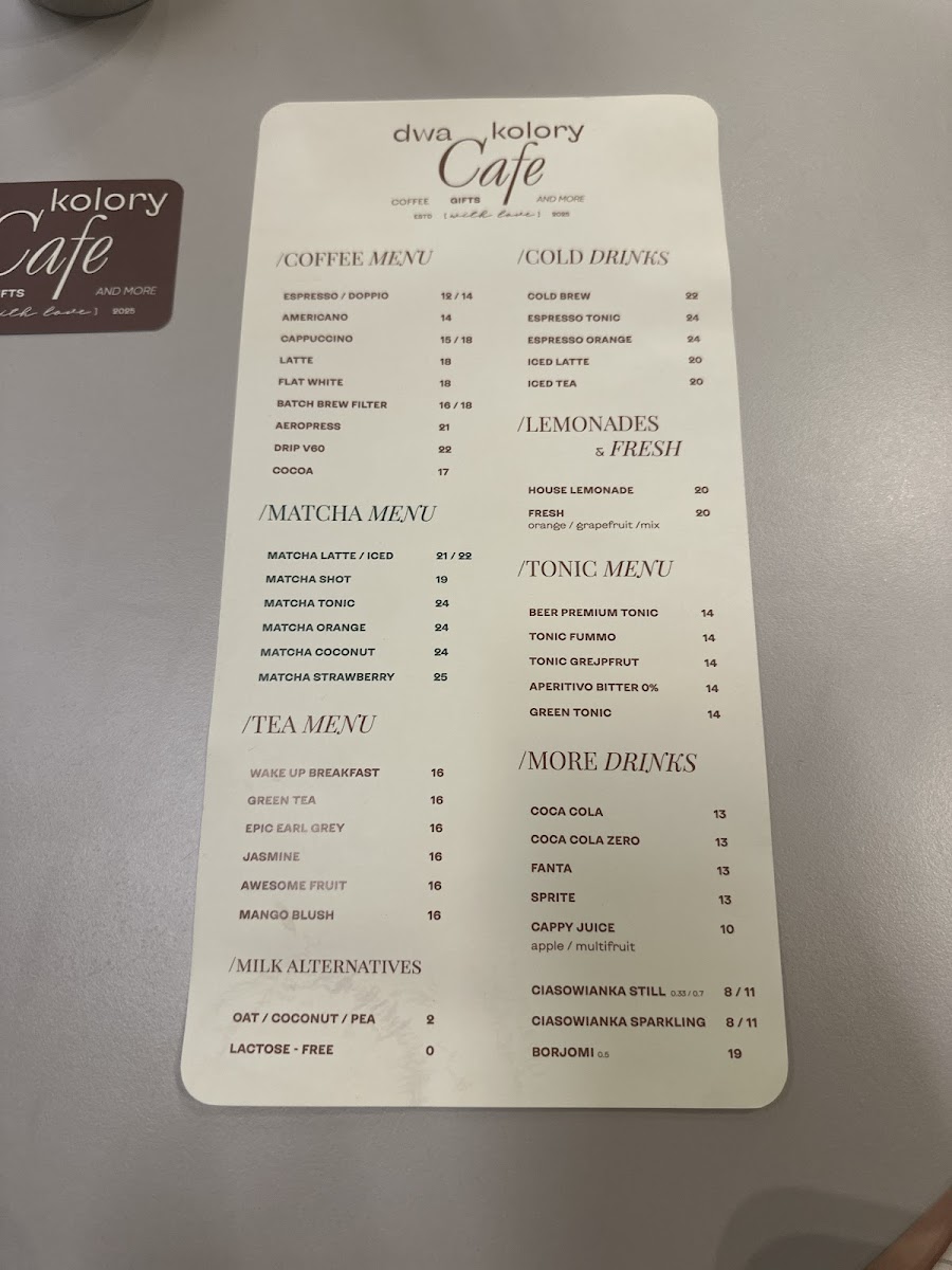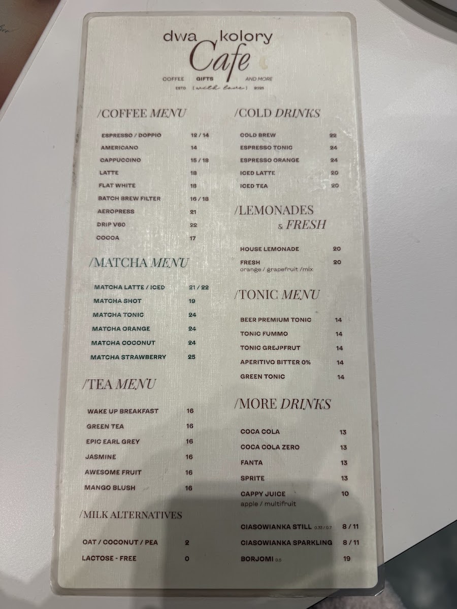The menu at Dwa Kolory Cafe offers a selection of beverages and light food items suitable for coffee breaks or casual dining. Visitors can expect a variety of coffee drinks, including hot and iced options, as well as teas served with attention to proper preparation methods, such as green tea at a specific temperature. The cafe also provides homemade lemonades and hot cocoa.