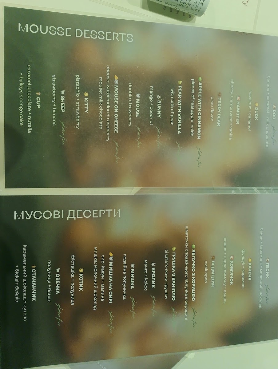 In addition to drinks, the menu includes a range of desserts and baked goods. These feature cakes in various shapes and designs, including animal-themed cakes, as well as items like waffle cake and waffle tubes with fillings such as condensed milk. Options for different dietary preferences are available, with milk choices including regular and lactose-free alternatives.